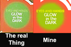 On the real "Eyes and hands glow in the dark" blurb the green fringe extends beyond the letters. On mine the letters extend beyond the green fringe.